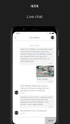 iazzun edistyksellinen lisätyn todellisuuden (AR) teknologia muuttaa taiteen hankinnan helpoksi ja jännittäväksi. Kokeile teoksia omilla seinilläsi ennen päätöstä ja visualisoi, kuinka ne täydentävät tilasi täydellisesti. Pysy ajan tasalla taidemaailman sykkeessä: iazzu varmistaa, ettet koskaan jää paitsi näyttelyistä, galleria-avajaisista tai eksklusiivisista taidetapahtumista. Lisäksi voit syventää kokemustasi keskustelemalla suoraan taiteilijoiden ja instituutioiden kanssa iazzun reaaliaikaisen keskustelutoiminnon kautta – tutustu tarinoihin teosten takana ja muodosta merkityksellisiä yhteyksiä luojiin.