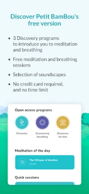 Petit BamBoun avulla voit tutustua mindfulnessin periaatteisiin helposti ja ilman sitoumuksia. Sovelluksen ilmainen versio sisältää kattavat aloitusohjelmat niin aikuisille kuin lapsillekin 'Discovery'- ja 'Discovery for Kids' -kokonaisuuksineen. Valittavanasi on kolme päivittäistä meditaatiota sekä rentouttavaa taustamusiikkia, joka auttaa keskittymään tai nukahtamaan. Animoidut tarinat selventävät mindfulnessin perusajatuksia, ja saat rajattoman pääsyn vapaahengitys- ja meditaatiotyökaluun rentoutumiseen ja sydämen koherenssiharjoituksiin. Kaikki tämä ilman mainoksia ja luottokorttitietojen syöttämistä, ja huomaavainen asiakaspalvelumme on aina valmiina auttamaan.