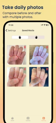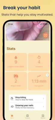NailKeeper auttaa sinua lopettamaan kynsien pureskelun. Seuraa kynsiesi kasvua valokuvien, ennen ja jälkeen -vertailujen sekä videoiden avulla. Näe edistymisesi ja pysy motivoituneena. Hanki vinkkejä ja hallitse tapaa tehokkaasti.