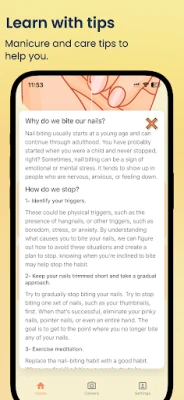 Oletko valmis sanomaan hyvästit vanhalle tavalle ja toivottamaan kauniit, terveet kynnet tervetulleiksi? Kynsien pureskelusta tai näpertelystä luopuminen voi tuntua mahdottomalta tehtävältä, mutta NailKeeper tarjoaa ainutlaatuisen ja motivoivan lähestymistavan. Tämä innovatiivinen sovellus auttaa sinua seuraamaan edistymistäsi visuaalisesti, näyttäen konkreettisesti, kuinka kyntesi toipuvat ja kasvavat. Näet omin silmin muutoksen, joka antaa sinulle voimaa ja inspiraatiota jatkaa matkaasi kohti tavoitettasi.